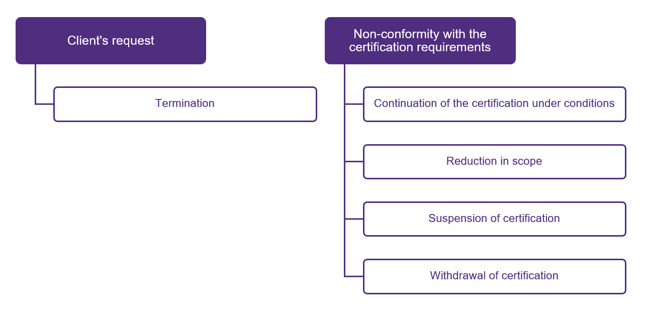 - Client’s failure to action the remedial actions in the prescribed period, or the investigation allowed to reveal any non-conformities, results in reduction of the scope or withdrawal of certification.