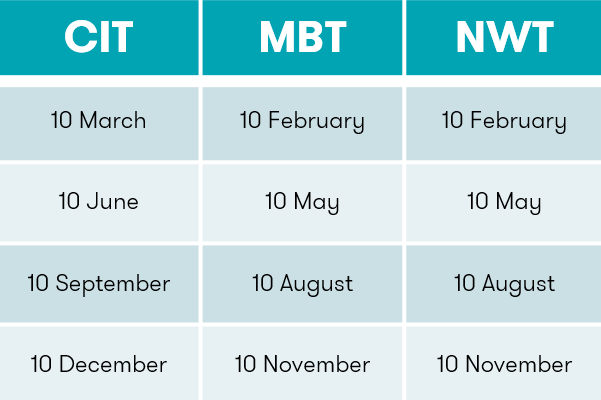 Each year, taxpayers receive a tax advance schedule detailing the required advances for Corporate Income Tax (CIT), Municipal Business Tax (MBT) and Net Wealth Tax (NWT), if applicable.